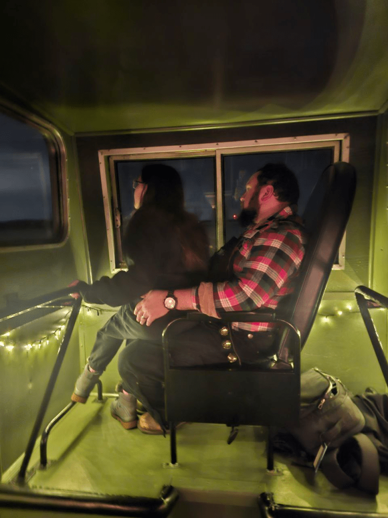 With his caboose positioned just two cars behind the iconic 1225, Mike welcomed us at the admission gate nearest the locomotive, dressed to the nines in authentic C&O passenger conductor regalia. As I approached the car, I admired the metal work that had been completed during its restoration, the blue paint gleaming in the setting sun, and the iconic “C&O For Progress” slogan proudly emblazoned on the side. As we boarded the car and stepped through the “A-end” door, I immediately felt the warmth of the air heated by the caboose’s oil fueled stove wash over me, reassuring me that this would be a cozy, comfortable evening.